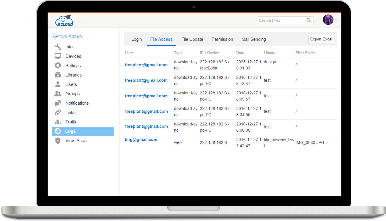 - Access log: file access log via syncing clients, mobiles clients and Web interface