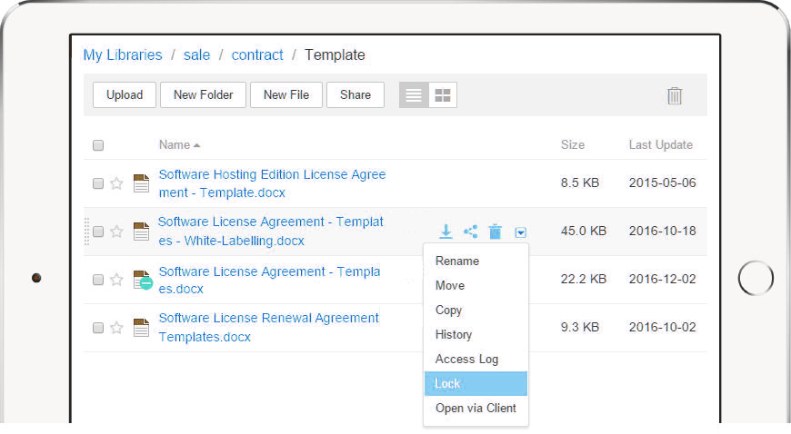 SCloud supports file locking to prevent concurrent editing of files and generating of conflicts files. Users can lock files in web UI or desktop clients. Office files are automatically locked when they’re opened.