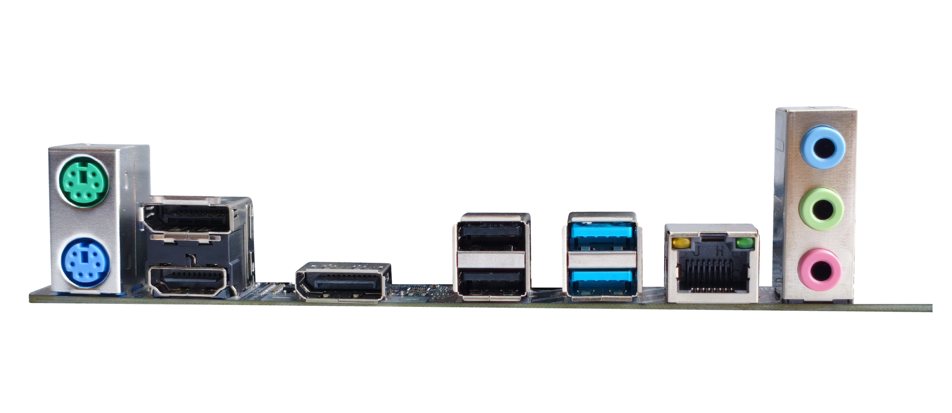 2x USB 3.2 Gen 1 ports (2 x Type-A) 2 x USB 2.0 ports (2 x Type-A) 1 x HDMI® port 2 x DisplayPort 1 x Realtek 1Gb Ethernet port 3 x Audio jacks 2 x PS/2 Keyboard/Mouse combo port |